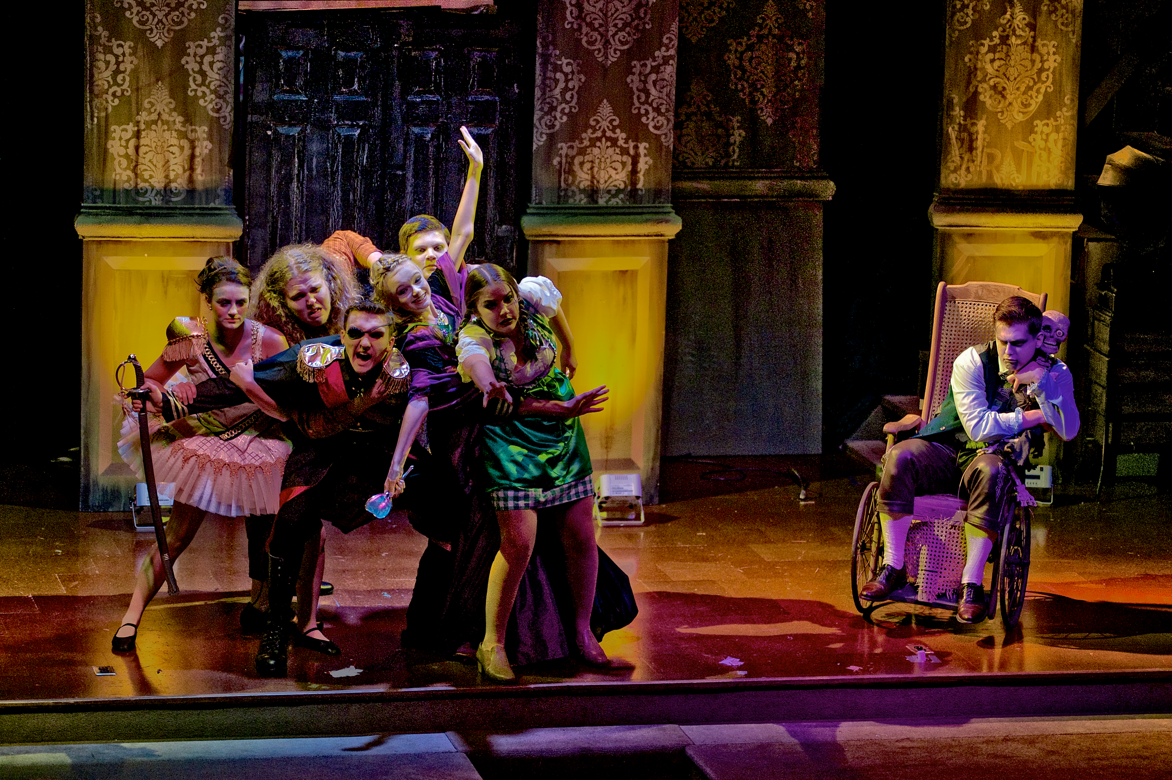 The clan of witches decide the fate of Beatrix. Pictured are: Sami Matthews (Petra); Adam Lucas (Udolf); Ethan Lawson (Admiral Theodoric); Rosalinde (Baylee Martin); Bastian (Micah Simmons); Yvonne (Lana Percell); and Klaus/Felix (Jordan Nickles)