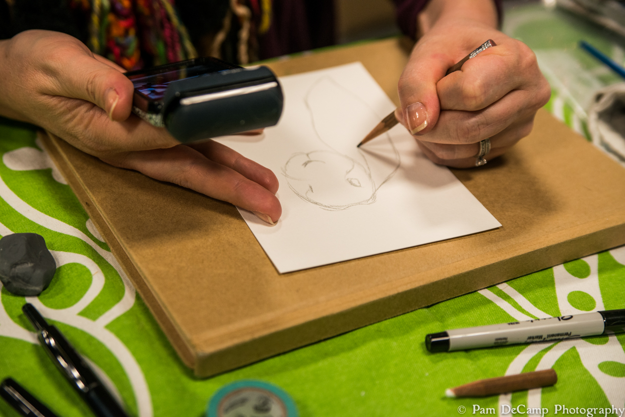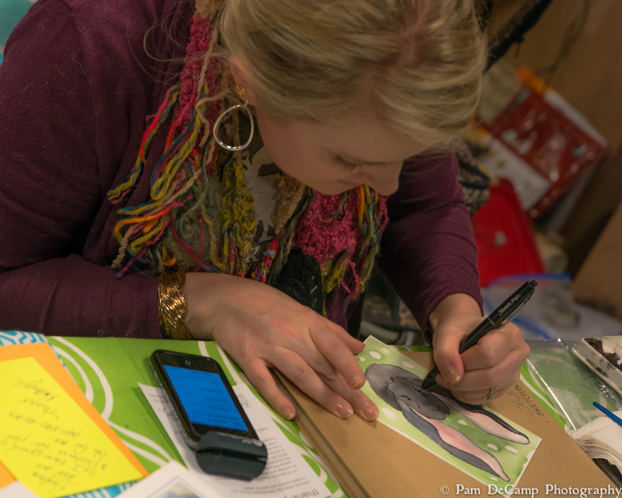 I stood at one of the tables and watched Andrea Biggs of Breath of Life Illustrations (www.facebook.com/breathoflifeillustrations) sketch bunnies for the crowd. She worked from photographs that were sent to her phone. It took her only about 30 minutes to go from the sketch to a full color rendition of the photograph of an individual’s beloved pet.